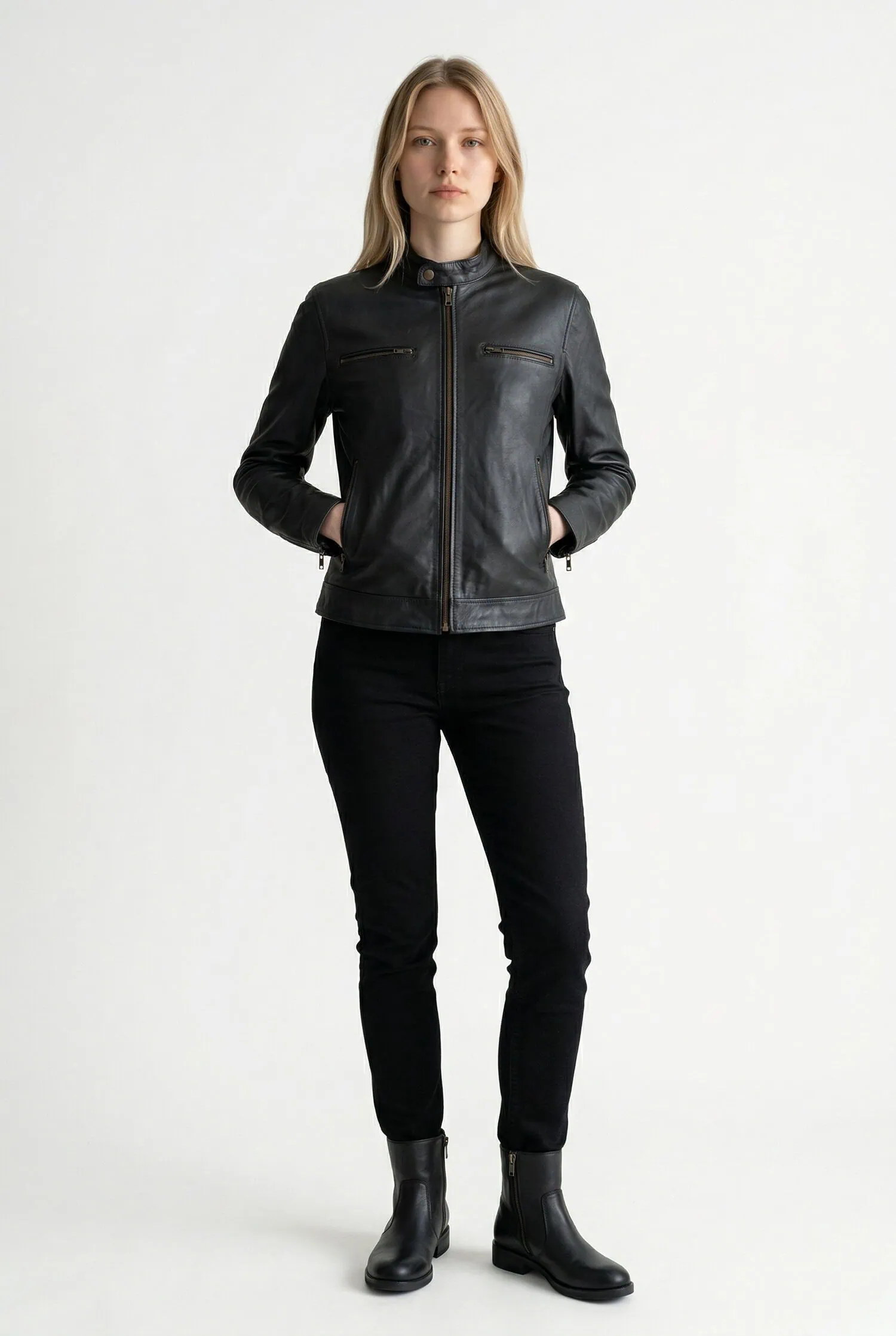 Chest zip detailing and practical side pockets introduce function while preserving the jacket’s minimalist edge. The result is a women’s leather jacket that feels both contemporary and enduring — refined enough for elevated styling, yet practical enough for repeat wear.